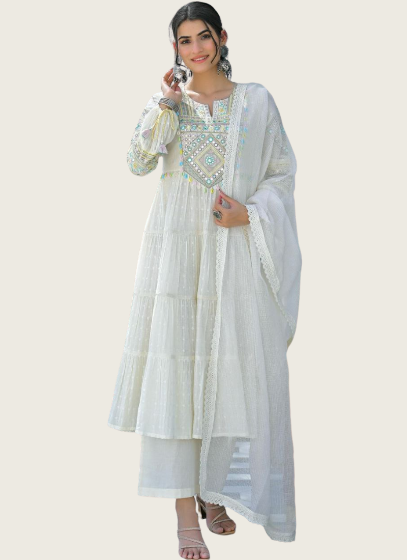 $75.00 AUDWhite Anarkali Gown in Flex Butti Cotton with Embroidery + Kota Dupatta