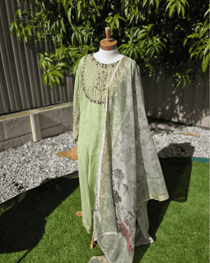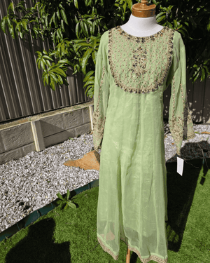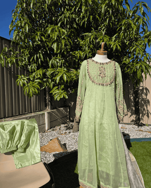 Pista Green Anarkoli Dress – Embroidered Chiffon with Silk Dupatta