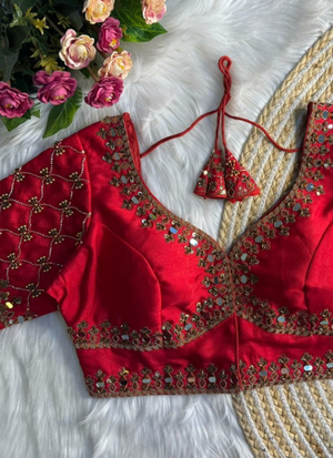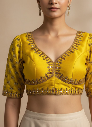 Thiswomen’s blouse is a premium partywear piece crafted fromheavy pure soft Italian silk with tricot fusing, designed to elevate festive and wedding looks. Featuringintricate jari embroidery with sequins and beads work, the blouse exudes elegance and luxury.