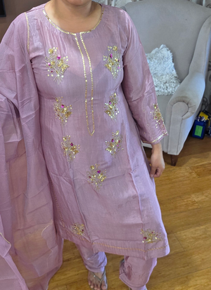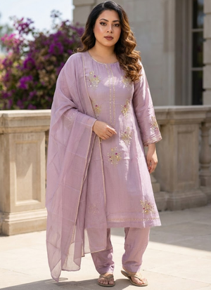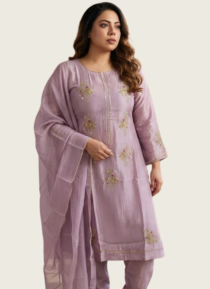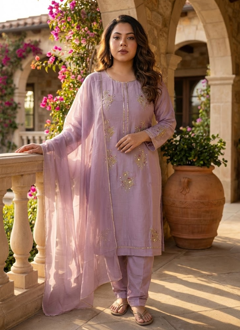 Thislight onion pink silk salwar kameez suit is a premium ethnic wear ensemble designed for elegance and sophistication. Crafted frompure silk fabric for both kameez and salwar, it featureshandwork with zari and sequence embroidery, adding richness and sparkle to the outfit.