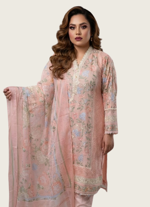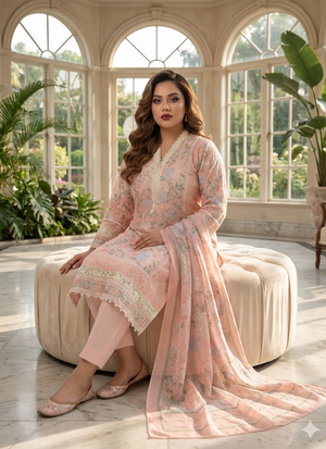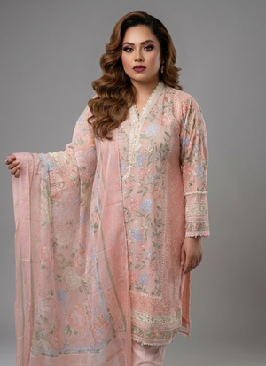 Thislight peach pink chiffon salwar kameez suit is a premium ethnic wear ensemble designed for elegance and sophistication. Crafted withchiffon fabric for the kameez, satin for the salwar, and georgette for the dupatta, it offers a luxurious drape and refined finish.