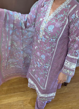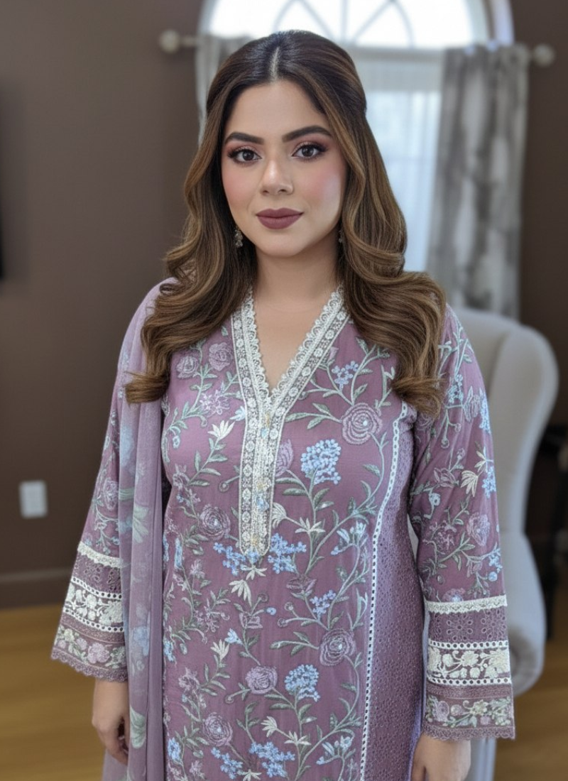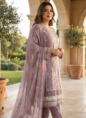 Thislight purple chiffon salwar kameez suit is a premium ethnic wear ensemble designed for elegance and sophistication. Crafted withchiffon fabric for the kameez, satin for the salwar, and georgette for the dupatta, it offers a luxurious drape and refined finish.