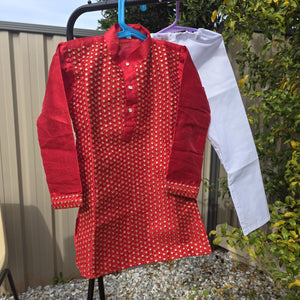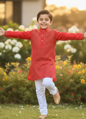 Kids Kurta Pajama – Red Silk Kurta with White Cotton Pyjama
