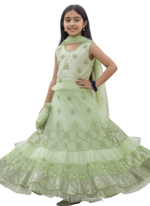 Let your little one embrace tradition with a touch of modern elegance in this paste-colored kids lehenga, crafted from airy organza for a look that’s both graceful and celebration-ready. Perfect for weddings, Eid, Diwali, and cultural events, this outfit blends South Asian heritage with a soft, contemporary vibe—ideal for young girls who love to dress with charm and confidence.