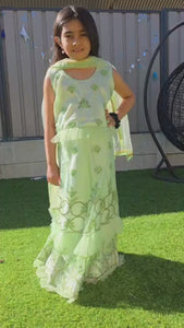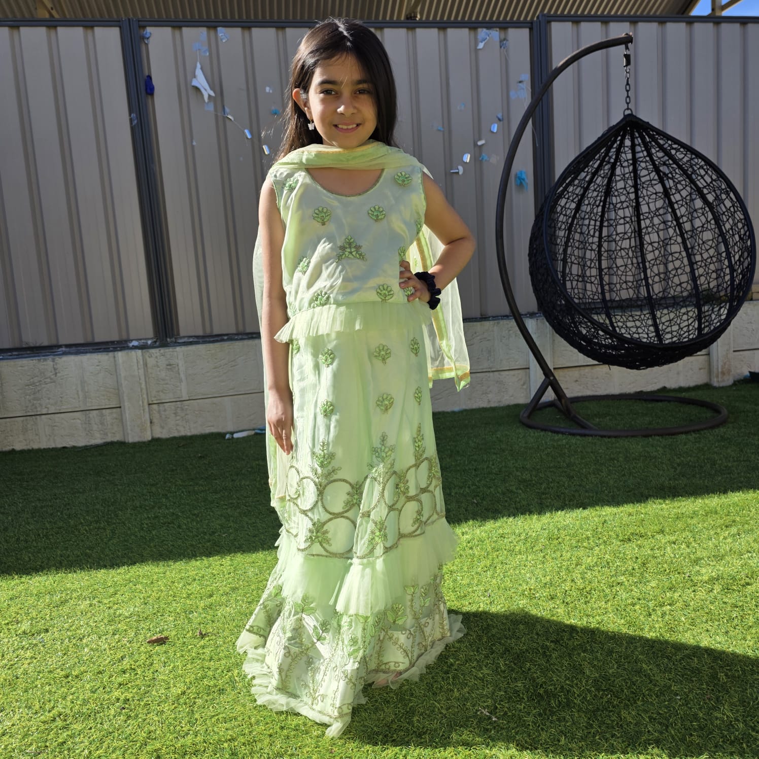 🌸 Soft paste tone: A unique pastel shade that flatters all skin tones 🌏 South Asian kids outfit: Perfect for diaspora families in Australia 💃 Festive-ready lehenga: Ideal for Eid, Diwali, weddings, and school events 🌬️ Organza comfort: Lightweight and breathable for all-day wear 👧 Made to twirl: Flared skirt adds movement and joy.
