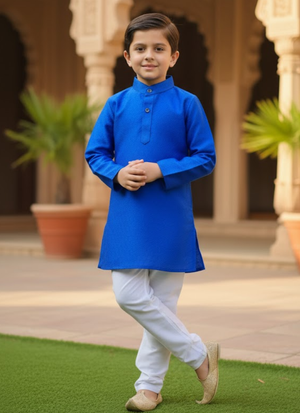 Dress your little prince in timeless elegance with our Royal Blue Silk Kurta and White Cotton Pyjama Set – a standout kids kurta pajama ensemble designed for South Asian families in Australia. Whether it’s a wedding, Eid, Diwali, or a school cultural event, this outfit blends festive charm with everyday comfort.