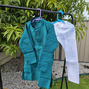 Let your little one shine in traditional style with our Sea Green Silk Kurta and White Cotton Pyjama Set – a vibrant kids kurta pajama outfit designed for South Asian families in Australia. Whether it’s Diwali, Eid, a wedding, or a school cultural event, this ensemble blends festive flair with everyday comfort.