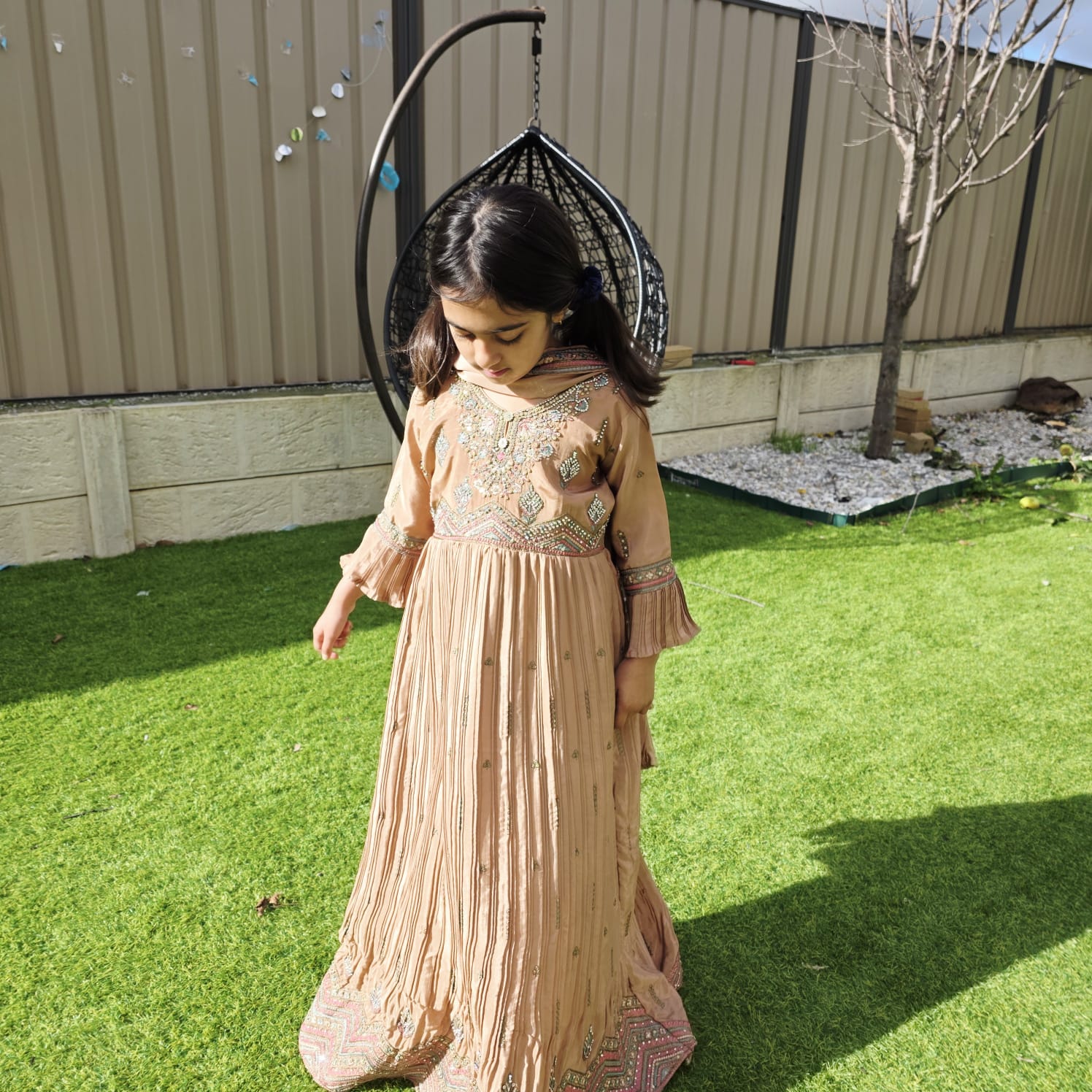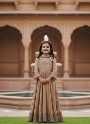 Let your child step into elegance with this kids Anarkali gown, a luxurious ensemble crafted from rich silk and tailored for festive occasions. Whether it’s a wedding, Eid, Diwali, or a cultural celebration, this outfit brings timeless South Asian charm to young girls who love to dress up in style.