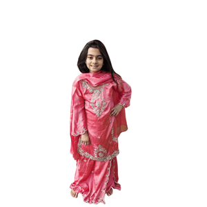 Let your child shine in this silk sharara suit for girls, where tradition meets comfort and style. Add it to your festive wardrobe and make every celebration memorable.
