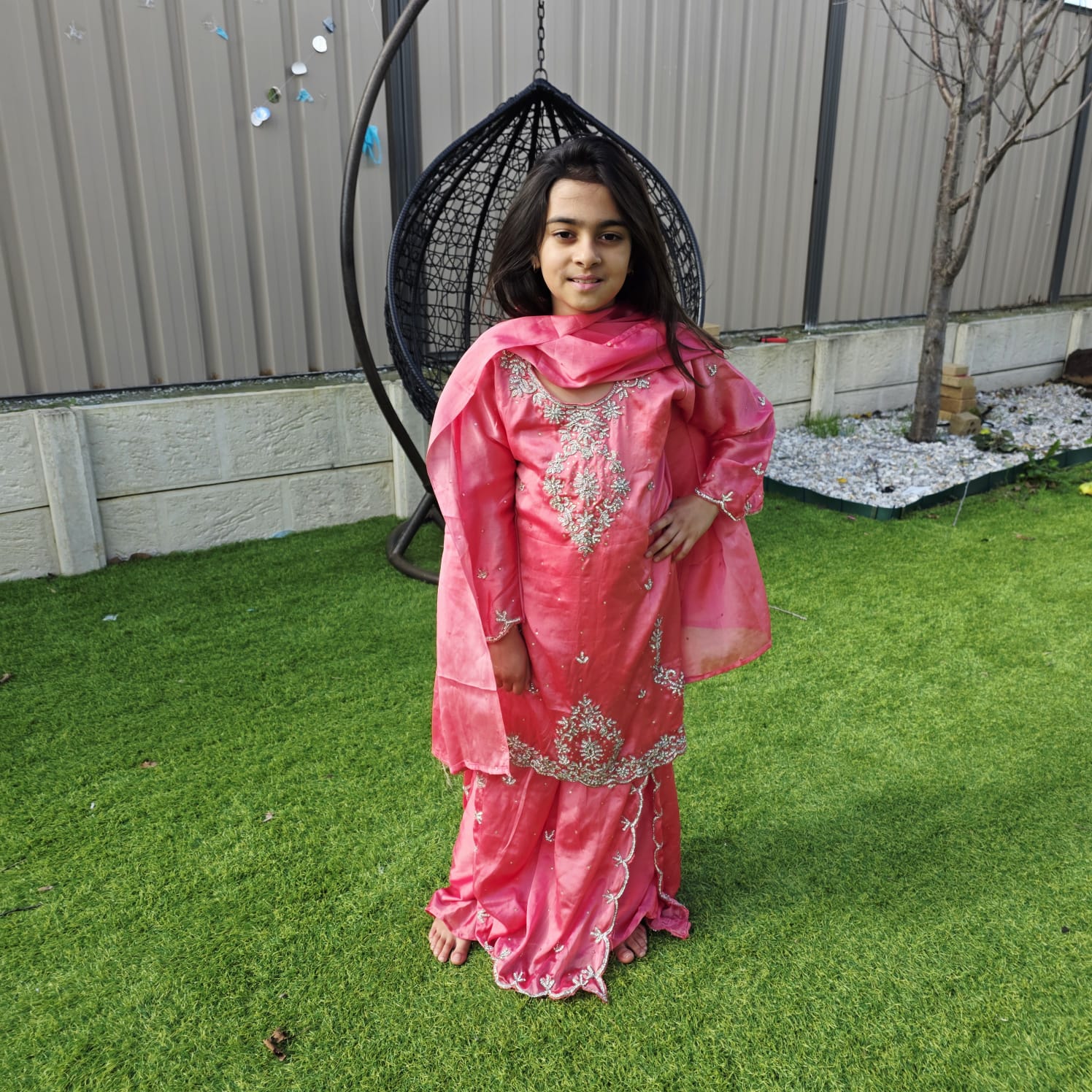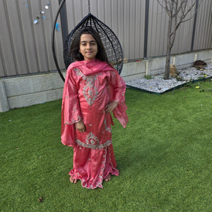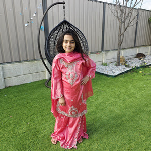 Celebrate tradition with a modern twist in this kids silk sharara suit, thoughtfully designed for young girls who love to dress up in vibrant ethnic wear. Whether it’s a wedding, Eid, Diwali, or a cultural event, this outfit blends elegance with playful charm—perfect for the South Asian diaspora in Australia.