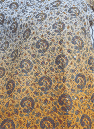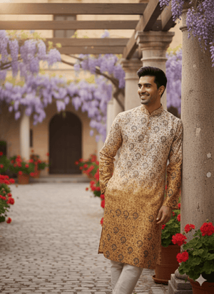 Stand out in style with this Men’s Kurta in a striking dual tone of white and orange. Crafted from soft linen cotton fabric, this kurta combines comfort with elegance. The detailed embroidery, printed design, and sequence work make it a perfect choice for weddings, festivals, or cultural gatherings.