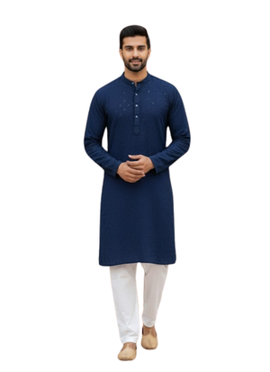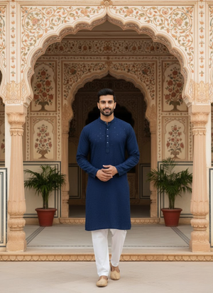 Thisembroidered navy bluemen’s kurta is a wardrobe essential for anyone who values tradition with a modern twist. Comfortable, stylish, and versatile,it’s the perfect choice for festive gatherings or everyday ethnic wear.