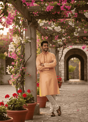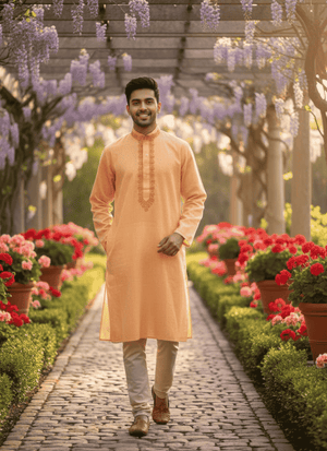 Add a fresh and elegant touch to your wardrobe with thisPure Cotton PeachMen’s Kurta. Designed withfine thread embroidery, this kurta blends comfort with festive charm. The soft cotton fabric ensures breathability, while the peach shade offers a modern yet traditional look. Perfect for weddings, cultural events, or casual festive gatherings, this kurta is versatile and stylish.