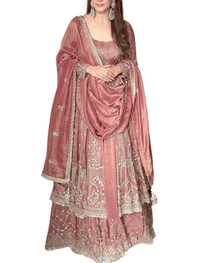 • Elegantlong Anarkali gown with dupatta for a complete festive look