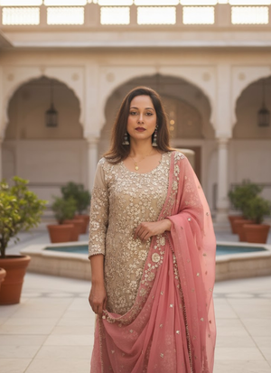 The kameez is designed with a graceful 46-inch length and a 44-inch chest, offering a flattering fit that complements various body shapes. Paired with a 38-inch salwar, the ensemble ensures comfort without compromising on style. The chiffon dupatta, adorned with Gota Patti detailing and a shimmering zari border, adds a regal touch to complete the look.