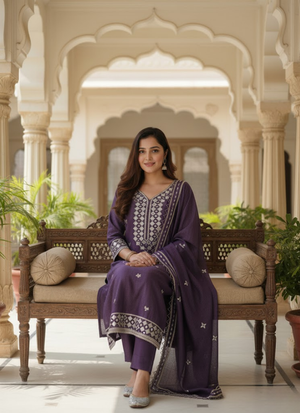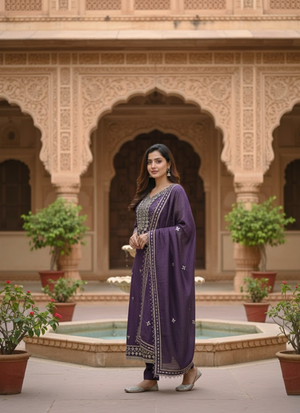 Thisdark purple silk salwar suit is a premium ethnic ensemble designed for elegance and festive charm. Crafted fromshimmery silk fabric and adorned withmirror work embroidery on the dress and dupatta, it blends traditional artistry with modern sophistication. Perfect for weddings 💍, festive occasions 🪔, and cultural gatherings 🎉, this suit radiates regal appeal.