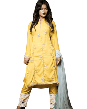 Thismustard yellow salwar suit is the perfect blend of elegance and tradition, designed for women who love timeless style with a modern touch. Crafted fromMakhon georgette and paired withsatin pants featuring crochet work, thisembroidered salwar suit is ideal for weddings 💍, Eid, Diwali 🪔, and cultural gatherings 🎉. Whetheryou’re looking for aparty wear salwar suit or a gracefulPakistani salwar suit, this piece delivers sophistication and comfort in one