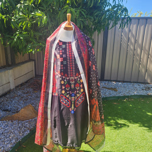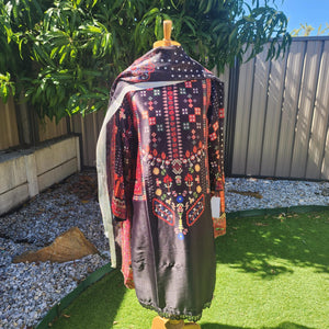 Graceful, lightweight, and effortlessly elegant—this Pakistani satin salwar suit is a timeless addition to your festive wardrobe. Designed as a 3-piece suit, it includes a smooth satin kamiz and salwar, paired with a sheer Kota dupatta that adds a touch of sophistication.