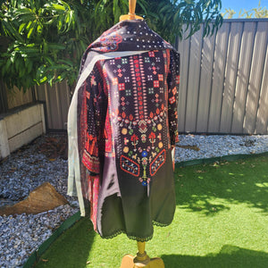 Perfect for Eid, Diwali, weddings, or cultural events, this ensemble blends traditional Pakistani tailoring with breathable fabrics and a flattering silhouette. The satin finish offers a subtle sheen, while the Kota dupatta brings balance with its airy texture and delicate drape.
