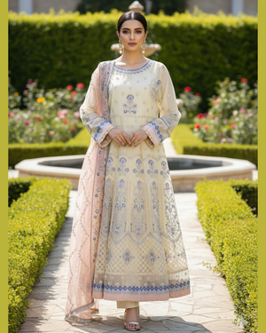 ThisPakistani beige Anarkali dress is a luxurious ethnic ensemble crafted fromorganza fabric with embroidery, pearl, and stone work. Designed to exude elegance and sophistication, it is perfect for weddings 💍, festive occasions 🪔, and cultural gatherings 🎉. The flowing silhouette of theAnarkali dress paired with matching pants creates a regal look that blends tradition with modern artistry.