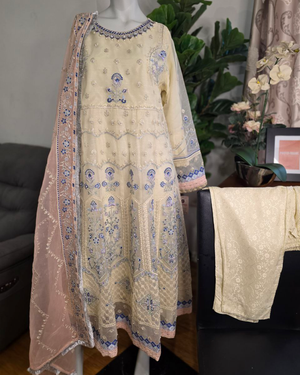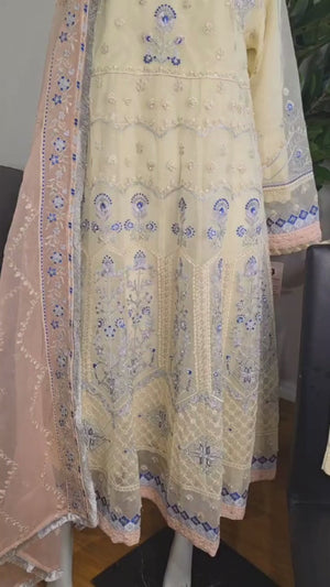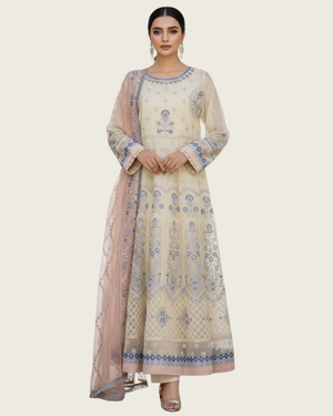 Beige Organza Pakistani Anarkali Dress – Pearl & Stone Embroidery