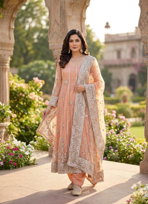 ThisPakistani Anarkali dress is a graceful ethnic ensemble crafted fromnet fabric with exquisitehandmade gota patti work. Designed in a softpeach color, it blends traditional artistry with modern elegance, making it perfect for weddings 💍, festive occasions 🪔, and cultural gatherings 🎉.