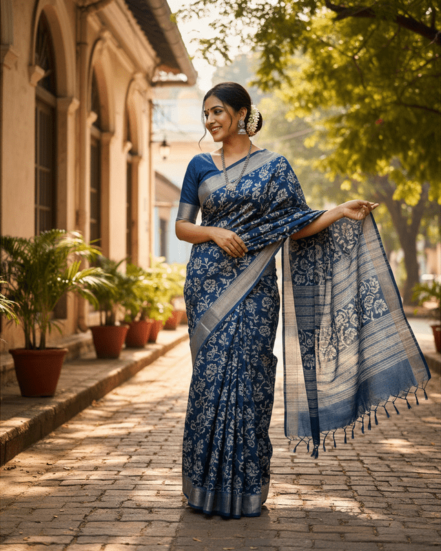 $57.00 AUDWhite Tashar Silk Saree – Water, Village & Floral Artistic Print