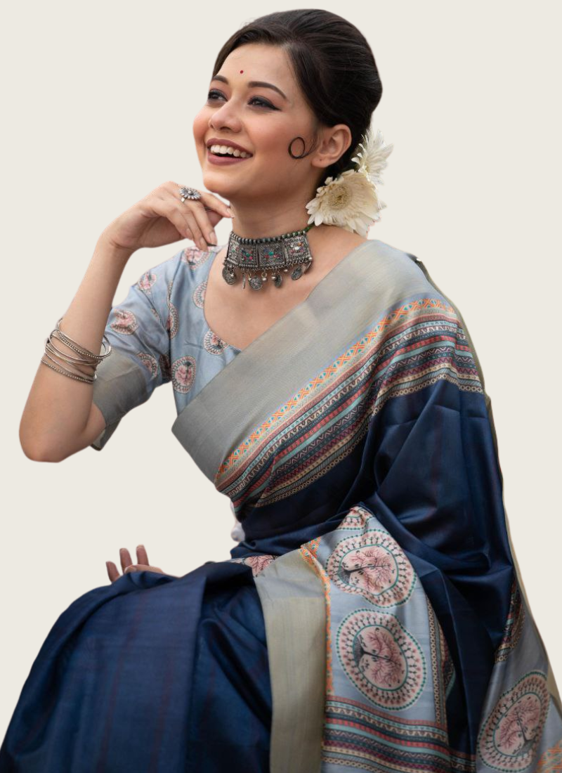 Tussar Print Silk Saree with Zari Border & Warli Pallu + Blouse Piece