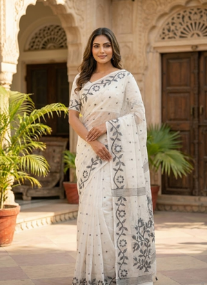 Thisblack & white tantuz saree in mixed maslin fabric is a premium ethnic ensemble designed for elegance and festive charm. Crafted from breathablemaslin blend with tantuz finish, it offers a graceful drape and luxurious sheen. Perfect for weddings 💍, festive occasions 🪔, and cultural gatherings 🎉, this saree radiates timeless sophistication.