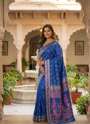ThisSharnachura silk saree in royal blue with human motif and zari work is a striking blend of heritage weaving and artistic storytelling. The deep royal blue shade radiates elegance and grandeur, while the intricate human motif woven into the fabric makes this saree truly distinctive. Enhanced with shimmering zari borders and pallu, it is perfect for weddings 💍, festive occasions 🪔, and cultural gatherings 🎉.