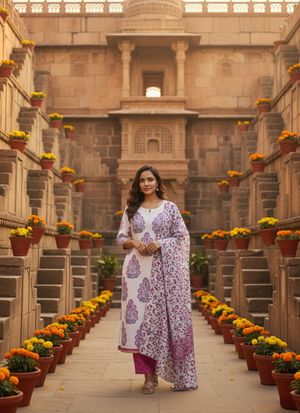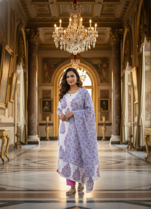 Thiscotton block printed salwar suit is a vibrant ethnic ensemble featuring awhite kurta with blue and pink block prints, paired with apinkblock printed pant and awhite-blue dupatta with matching block prints. Crafted for elegance and breathable comfort, it is perfect for weddings 💍, festive occasions 🪔, and cultural gatherings 🎉.