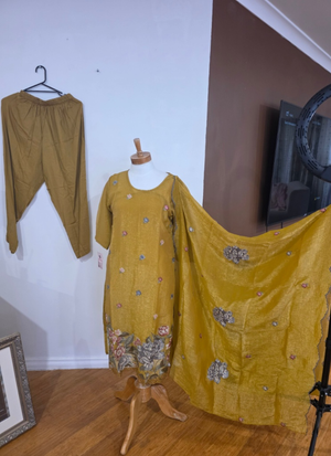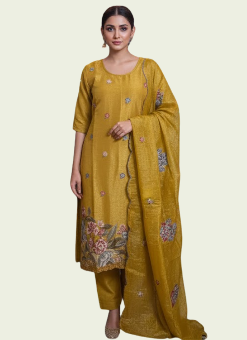 Thiscrepe silk salwar suit in radiantgold yellow is a luxurious ethnic ensemble designed for elegance and comfort. Featuringcross floral embroidery on the dress and dupatta, it blends traditional artistry with modern sophistication. Perfect for weddings 💍, festive occasions 🪔, and cultural gatherings 🎉, this suit adds timeless charm to your wardrobe.