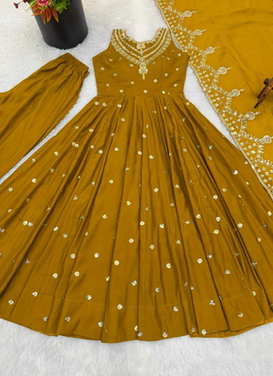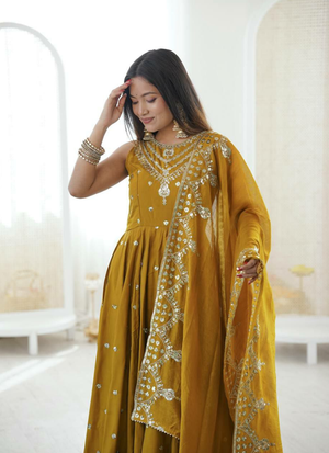 The bottom is stitched in Roman silk, complementing the gown perfectly. Completing the look is aChanderi silk dupatta, finished with embroidery sequins work, adding a graceful touch to the outfit. Fully stitched and ready to wear, thisanarkali dress saves tailoring time while delivering premium ethnic style.