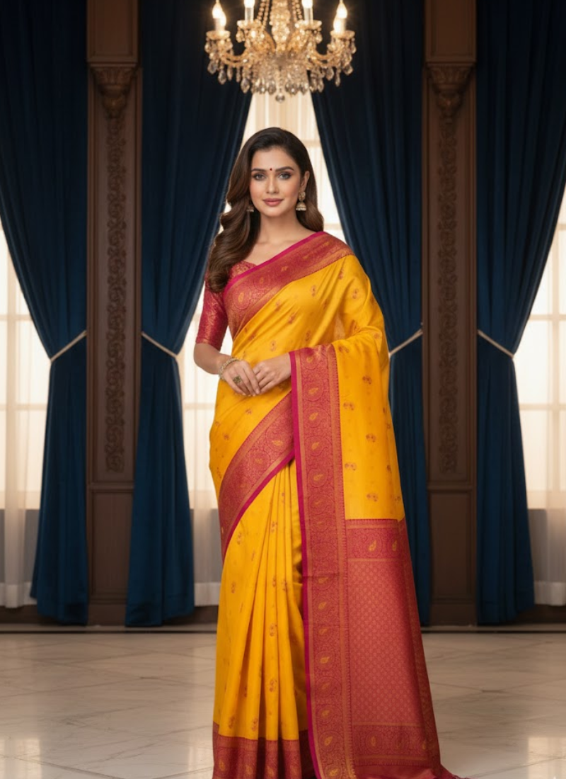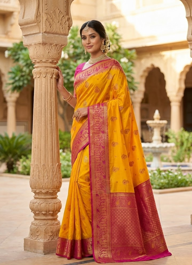 Thisbright yellow Katan silk saree with magenta border and mina work is a vibrant ensemble that celebrates traditional artistry with modern elegance. The luminous yellow base radiates joy and festivity, while the magenta border adds bold contrast. Mina work, combined with zari detailing, enhances the saree withintricate craftsmanship, making it perfect for weddings 💍, festive occasions 🪔, and cultural gatherings 🎉.