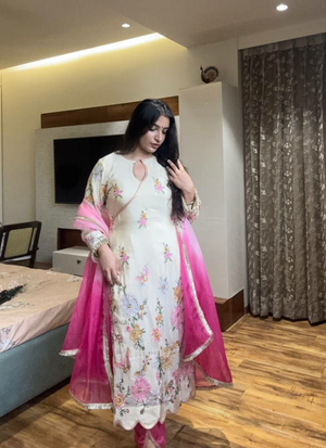 The salwaar is stitched in chinon withsamosa lace work, adding a touch of ethnic charm. Completing the ensemble is a2.2 m printed tabby organza dupatta, finished with ressa lace work, making this outfit a complete ethnic look.
