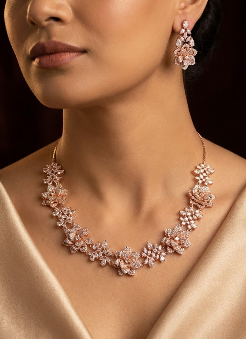 Thisdiamond cut necklace and earring set is a premium jewelry piece designed to add sparkle and sophistication to any occasion. Crafted withhigh‑quality diamond cut stones, the set features a luxuriousrose gold color finish that enhances brilliance and elegance.