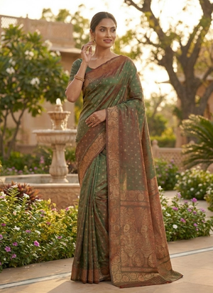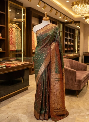 Thisgreen Katan silk saree with zari work and blouse piece is a masterpiece of traditional weaving. Known for its rich texture and lustrous finish, Katan silk is prized for its durability and elegance. The vibrant green shade paired with shimmering zari detailing makes this saree a perfect choice for weddings 💍, festive occasions 🪔, and cultural gatherings 🎉.