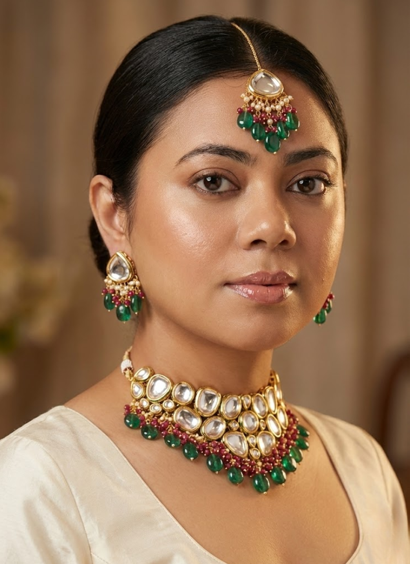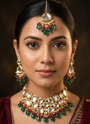 ThisKundan necklace set with earrings and a tikka, embellished with green and red beads, is a timeless piece of jewelry that blends traditional artistry with festive charm. The vibrant green beads symbolize prosperity, while the bold red beads radiate passion and celebration. Intricate Kundan stonework adds regal brilliance, making this set perfect for weddings 💍, festive occasions 🪔, and cultural gatherings 🎉.