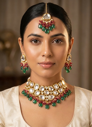 💡 Styling Tip: Pair thisKundan necklace set with green and red beads with a red lehenga or green saree for a radiant festive look 👑.