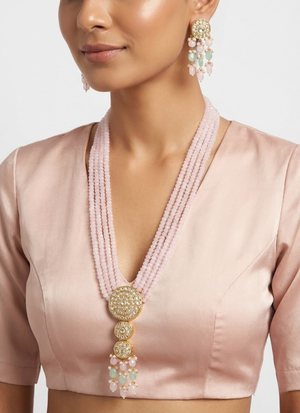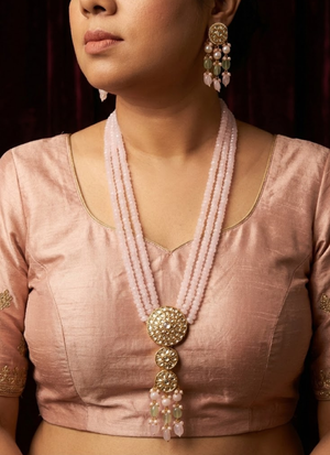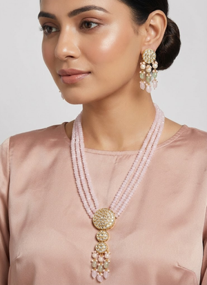 - Necklace: Long design with kundan and stone setting, accented with light pink beads.