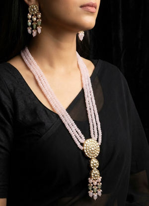 Thislong necklace with earrings is a premium jewelry piece designed to add elegance and sophistication to any occasion. Featuringkundan and stone setting with light pink beads, the necklace blends traditional artistry with modern appeal.
