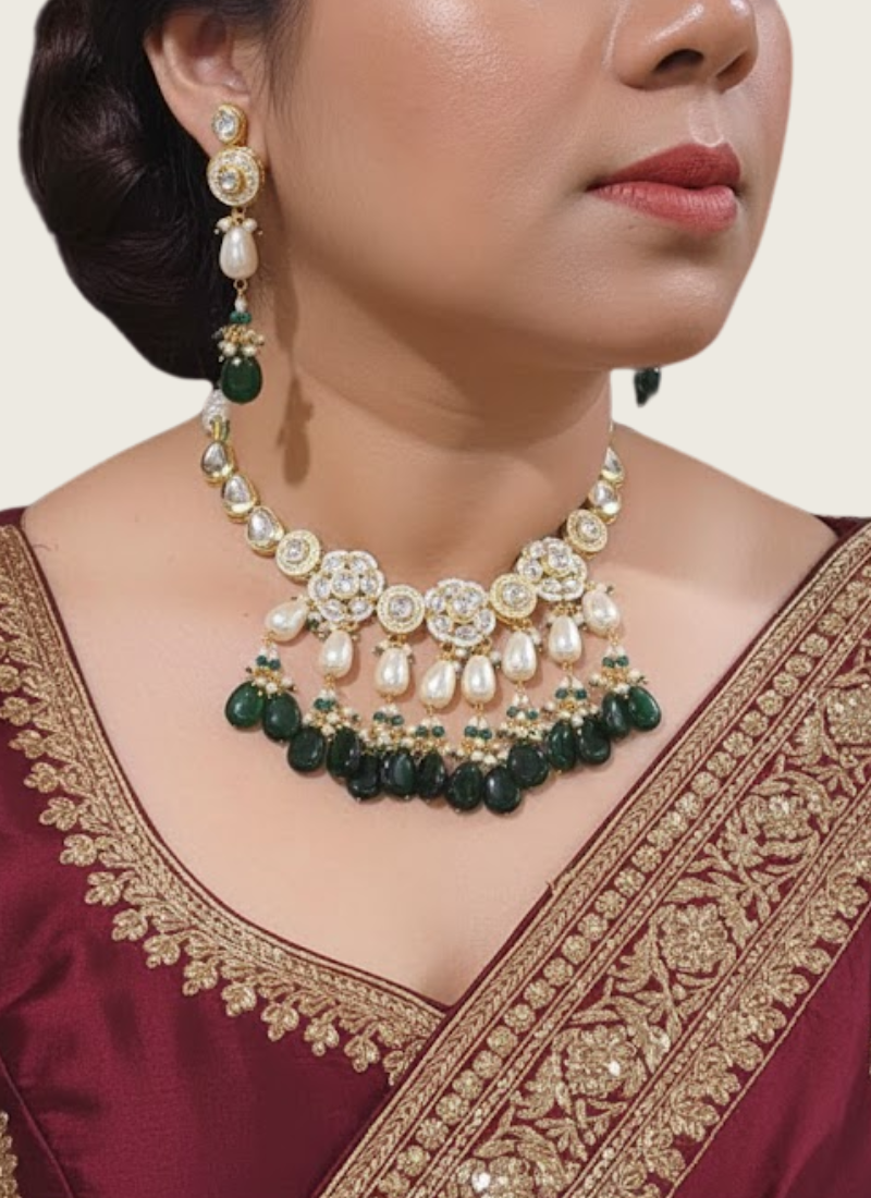💡 Styling TipPair thisgreen bead necklace set with earrings with a contrasting saree or lehenga in ivory, gold, or maroon for a striking festive look 👑.