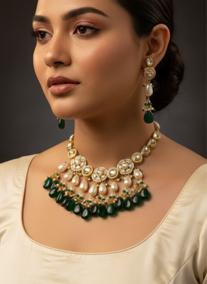 Thisnecklace set with earrings featuring green beads is a vibrant addition to your jewelry collection. The lush green beads bring a refreshing pop of color, making this set perfect for festive occasions 🪔, weddings 💍, or evening parties ✨.