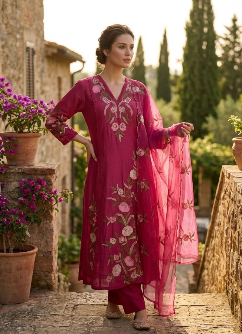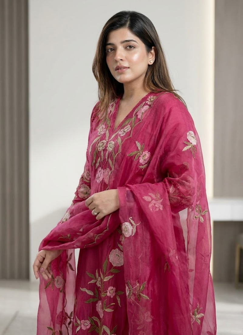 The pant is stitched in matching Chanderi silk, offering comfort and durability. Completing the ensemble is asoft organza dupatta, finished with embroidery and a fancy border, adding a delicate and festive touch. Lightweight yet premium, this outfit is ideal for women who love ready‑to‑wear ethnic fashion with a contemporary twist.
