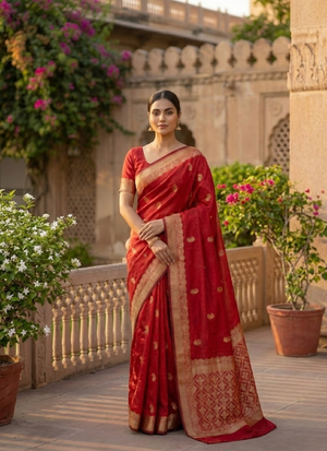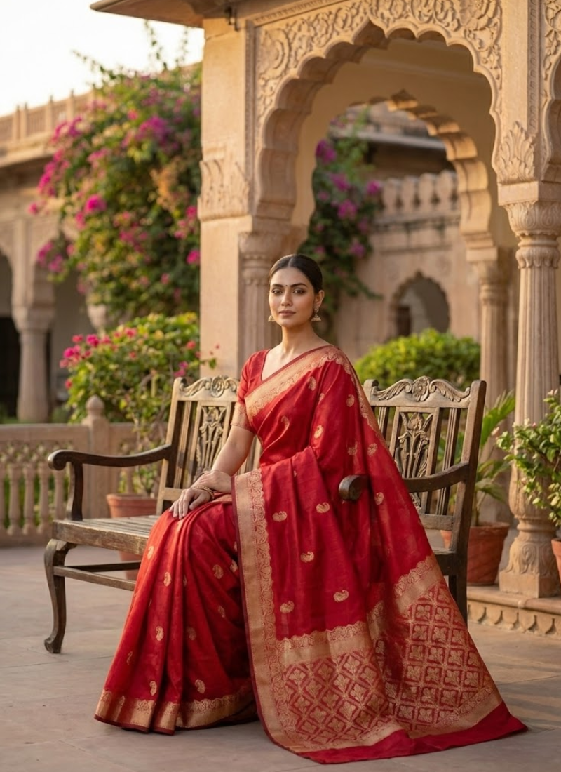 💡 Styling Tip Pair thisred Banarasi Katan silk saree with golden zari work with antique gold jewelry and a bold red lip for a regal festive look 👑.