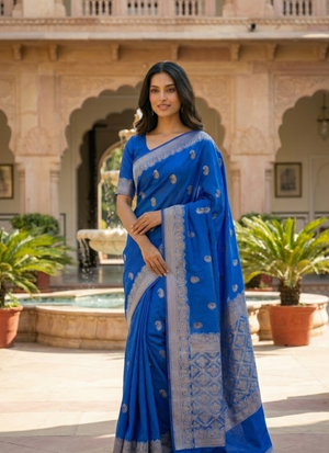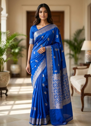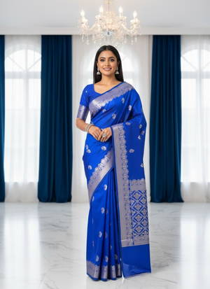 ThisBanarasi Katan silk saree in royal blue with golden zari work is a timeless masterpiece that embodies grandeur and tradition. The deep royal blue shade radiates sophistication, while the shimmering golden zari weaving adds festive brilliance. Perfect for weddings 💍, festive occasions 🪔, and cultural gatherings 🎉, this saree is designed to make you shine with elegance.
