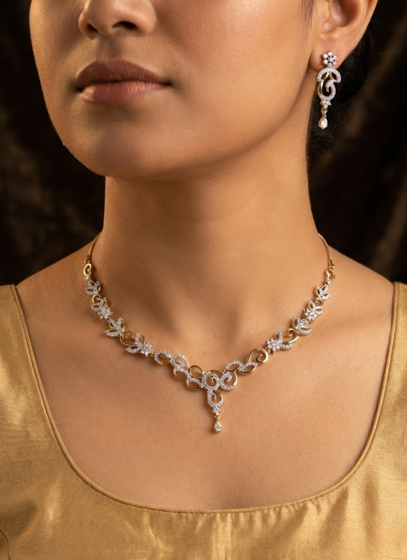 Thisnecklace and earring set is a premium jewelry piece designed to add sparkle and sophistication to any occasion. Crafted with asilver and gold dual‑tone setting, the necklace and earrings featurediamond cut stones that enhance brilliance and shine.