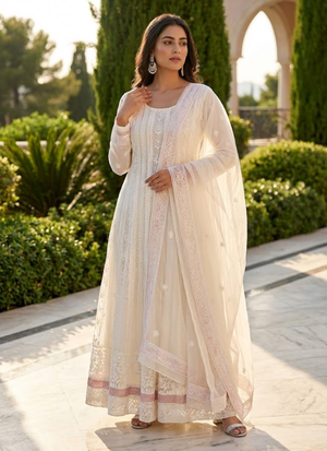 The highlight of this ensemble is its100% handmade Lucknowi embroidery, showcasing intricate detailing that reflects centuries of artisanal skill. Theclassic anarkali silhouette ensures a flattering fit, while the pristinewhite shade adds timeless sophistication to your festive wardrobe.