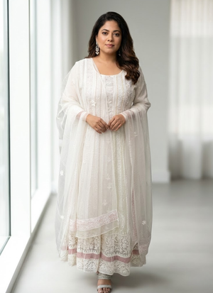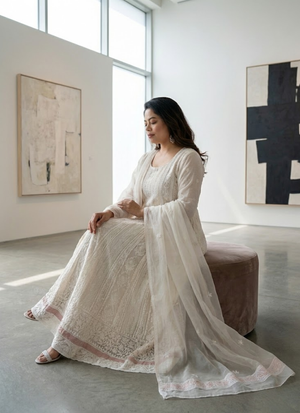 Thiswhite handmade Lucknowi anarkali salwar suit is a masterpiece of heritage craftsmanship and modern elegance. Crafted frompure maslin organza fabric for both anarkali and dupatta, it offers a soft, airy drape with a luxurious finish.